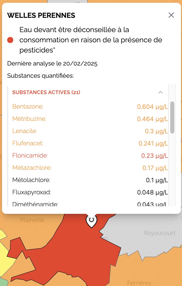 Si la carte fait état de 21 pesticides dits “actifs”, seuls 6 d'entre-eux dépassent le seuil de conformité (0,1μg/L → les 6 premières lignes du visuel présenté ici). Néanmoins, selon les retours de l'ARS, ils restent en deça des limites sanitaires admissibles.