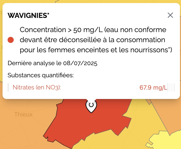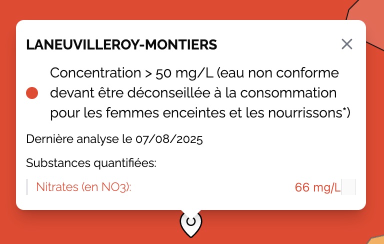 Ici les nitrates montrent un taux supérieur à la norme admise (50mg/L), de manière ponctuelle. L'ARS émet donc une recommandation de non consommation pour une partie de la population.